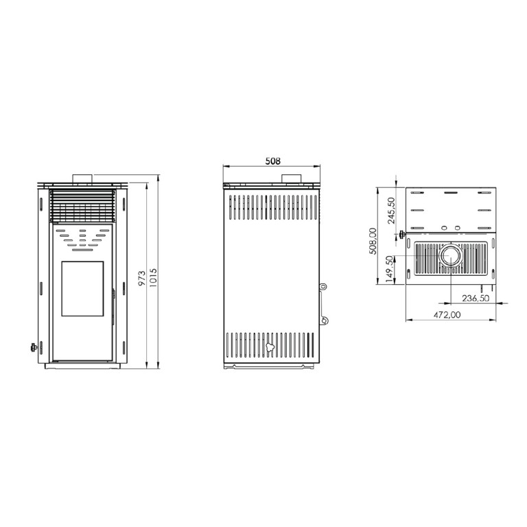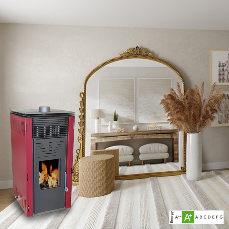 Estufa de pellet de aire de 14,3Kw, de la marca Eider Biomasa, de color burdeos que produce calor a través del pellet para calentar la estancia de la vivienda donde se ubique la estufa, con un rendimiento del 88%. El encendedor es manual lo que permite colocar la estufa en cualquier espacio del hogar. Medidas LxPxH 47,2 x 50,8 x 101,5cm.