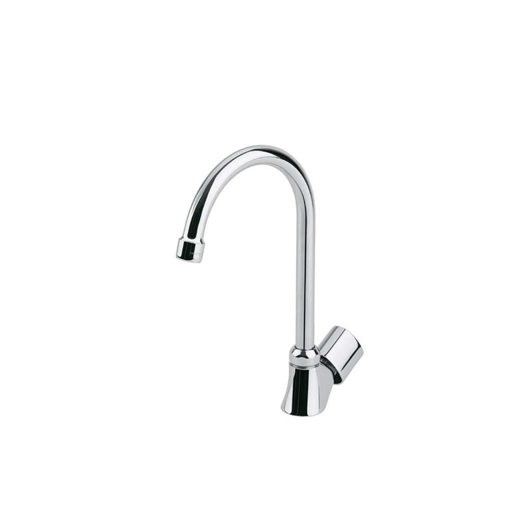 Grifo de fregadero con caño alto giratorio, de la marca Ramón Soler, para colocar en la cocina. Su diseño tiene un acabado cromado Diamond Finish, que cuenta con un mando sólo apto para el uso de agua fría lo que permite un gran ahorro. Dicha agua sale del grifo mediante un sistema que reduce la fuerza de salida del agua a 12L/Min. Se caracteriza por su comodidad y sencillez de uso. Perfecto para colocar en fregaderos grandes ya que permite llenar de forma cómoda recipientes de gran tamaño.
