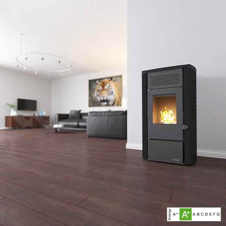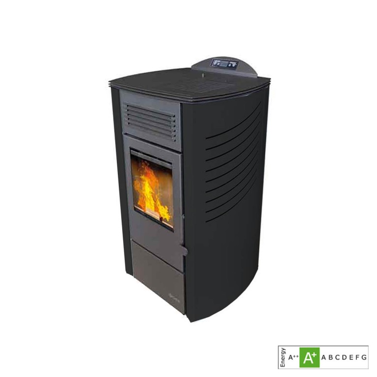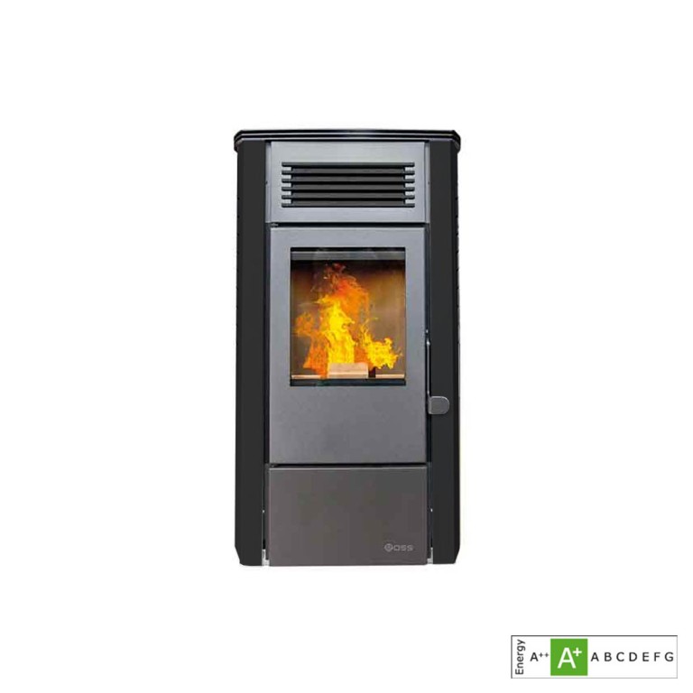 Estufa de pellet de 15,3Kw, de la marca Eoss, de color negro que produce aire caliente a través del pellet que expulsa por la rejilla frontal en la estancia donde se ubica. Su interior se caracteriza por tener un brasero de acero inoxidable que es un material resistente al fuego. Tiene una autonomía de combustión de entre 7 y 19 horas de duración con opción de controlar el estado de la estufa por mando a distancia o vía wifi. Medidas LxPxH 57x64x115cm.