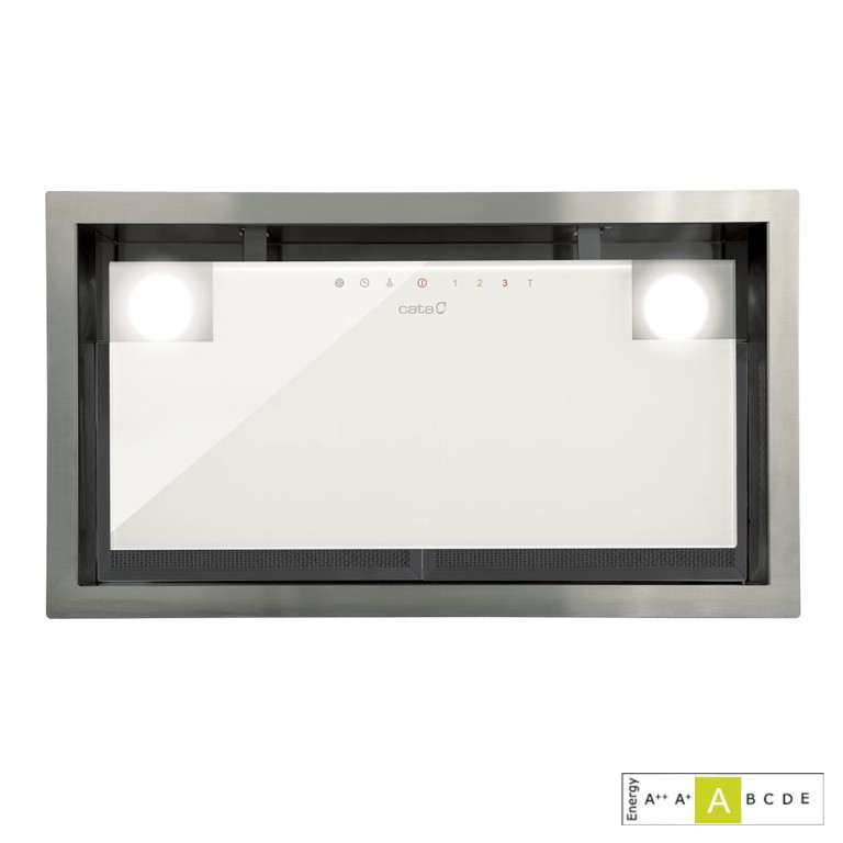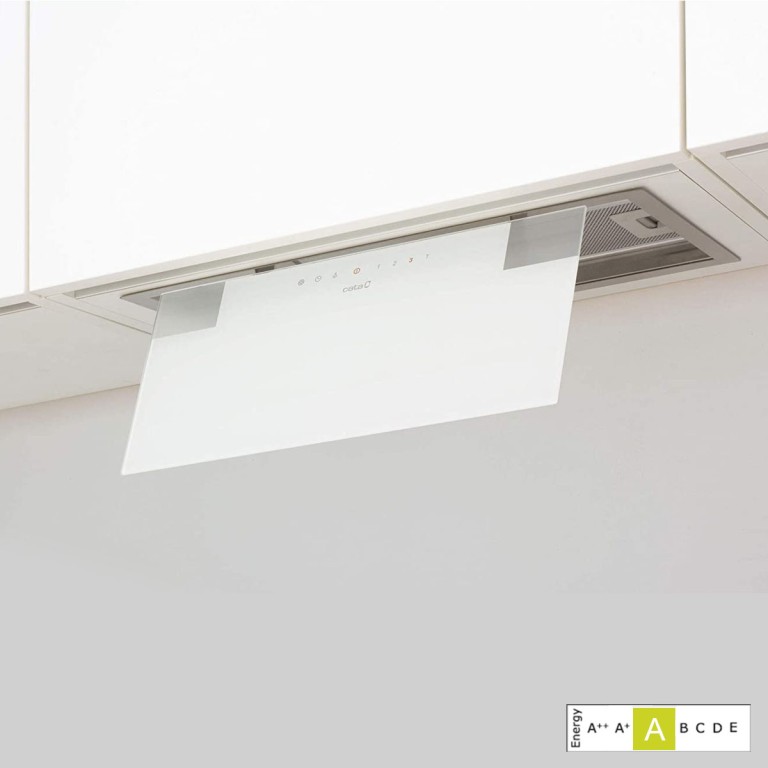 Campana extractora integrable de la marca Cata. Destaca su elegante diseño de cristal blanco y panel de control táctil con panel frontal abatible de cristal que permite una aspiración más directa, donde podemos programar el tiempo que estará en funcionamiento la extracción de aire, con desconexión automática e indicador de limpieza de filtros para un mantenimiento óptimo. Su motor es silencioso y alcanza una extracción máxima de 820m3/h. Medidas 49,2x27,7x300cm.