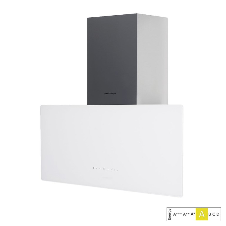 Campana vertical decorativa de Cata, diseñada en colaboración con los hermanos Roca. Destaca su elegante diseño con acabado en cristal blanco y su panel táctil con temporizador de desconexión automática e indicador de limpieza de los filtros, que podrás lavar en el lavavajillas para un mantenimiento óptimo. Su motor es silencioso y alcanza una extracción máxima de 850m3/h. Medidas 70x29x75,5/107cm.